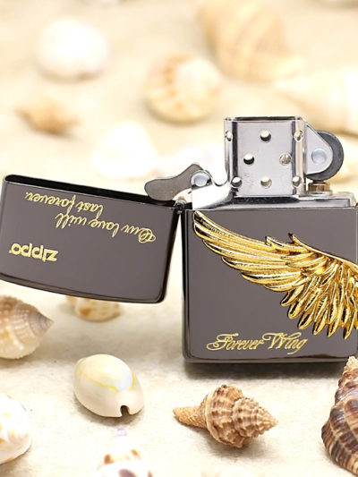 Bật lửa Zippo chính hãng với hoạ tiết gắn emblem cánh thiên thần vàng cực kỳ nổi bật trên nền sơn bóng đen