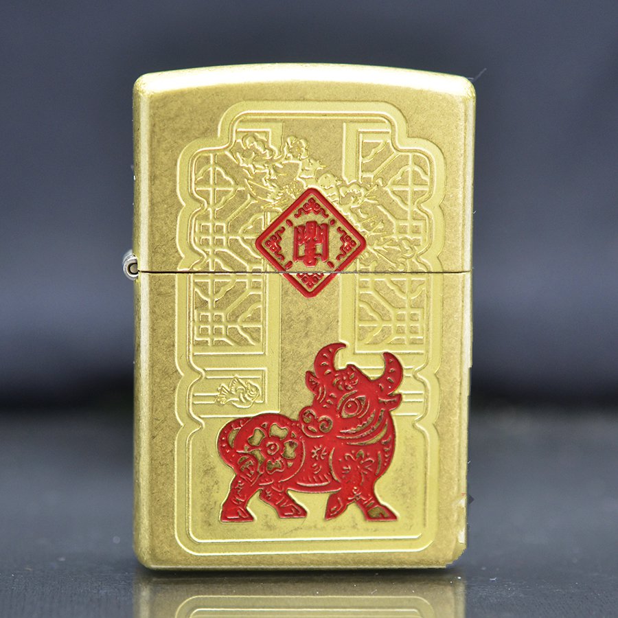 Zippo xuất Nhật vàng bụi in nổi chú trâu Tân Sửu ZN337